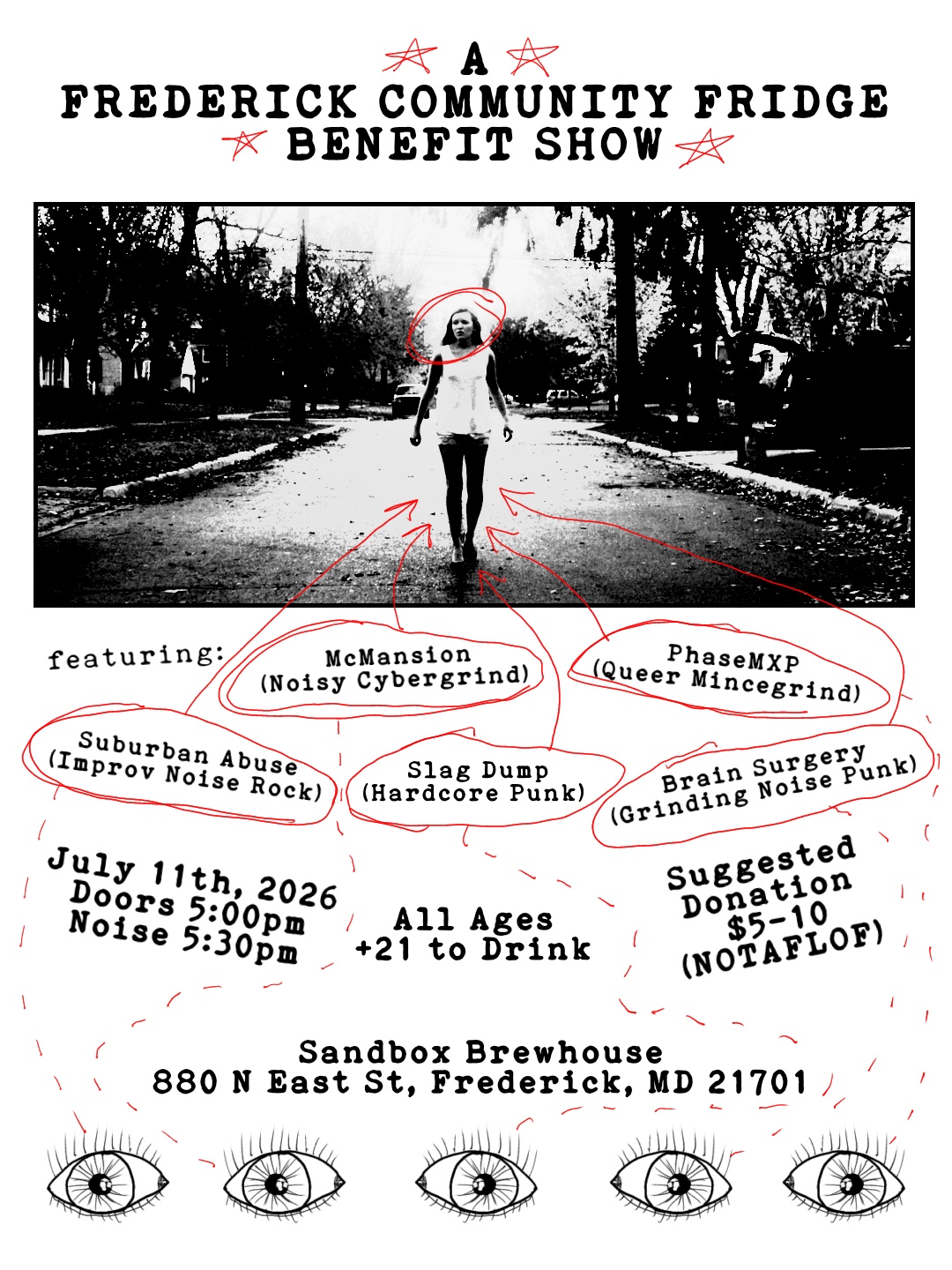Come support the Frederick Community Fridge at a show featuring: McMansion, PhaseMXP, Suburban Abuse, Slag Dump, and Brain Surgery. Doors open at 5PM and the noise starts 5:30. The show is open to all ages, but you must be 21+ to drink. Suggested donation $5-10. NOTAFLOF