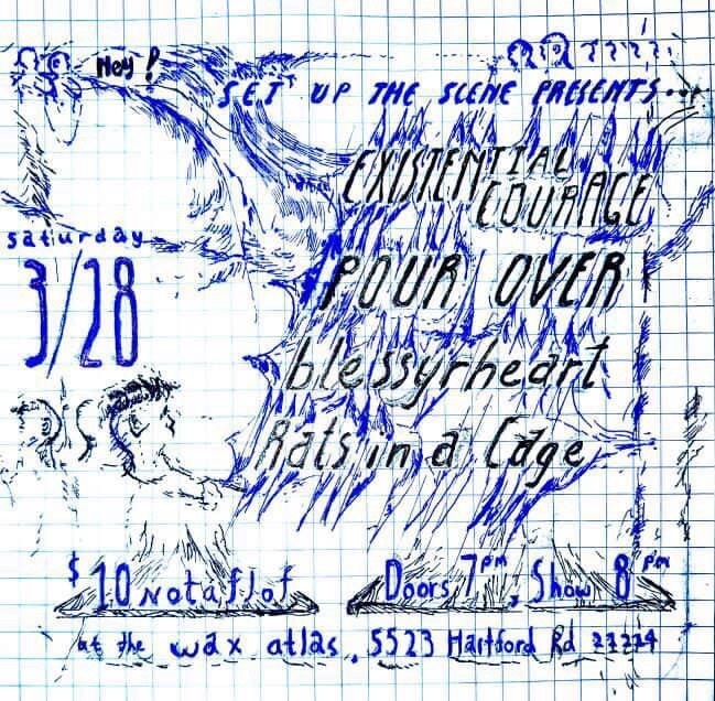 Set Up The Scene Presents a show with: Existential Courage, Pour Over, blessyrheart, and Rats in a Cage. $10 notaflof. Doors open at 7 PM. Must at 8 PM.