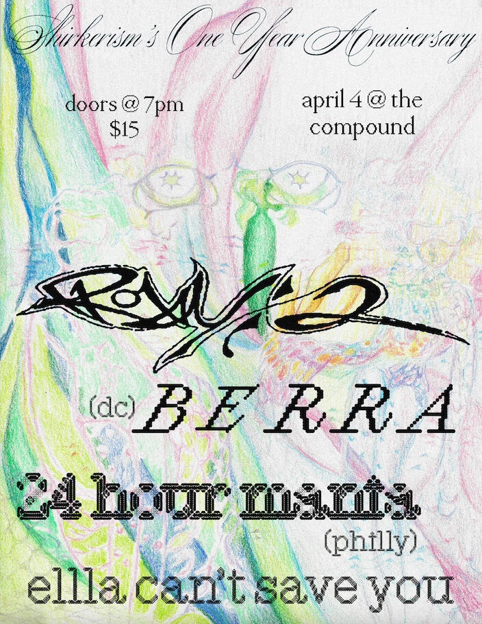 come celebrate our one-year anniversary with a night of music from roxy 2, berra, 24 hour mania, and ellla can't save you, tickets available down below. doors open at 7pm. music starts at 8pm. $15.